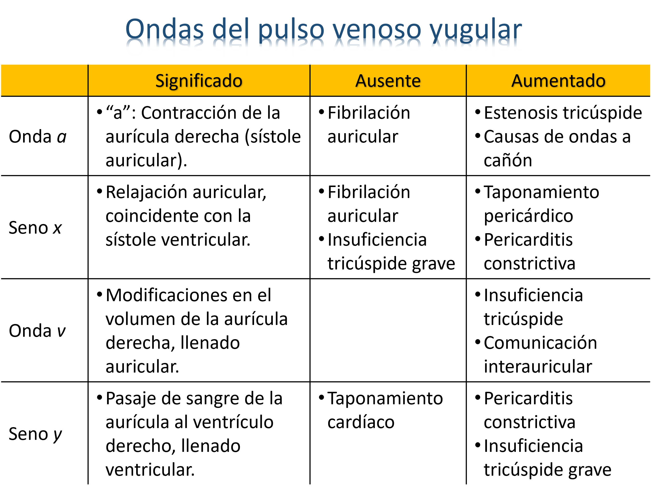 - Con el registro flebográfico, se comprueba que el pulso venoso está constituido por tres ondas positivas (“a”, “c” y “v”), de las cuales dos (“a” y “v”) son clínicamente detectables y, por dos ondas negativas denominadas senos “x” e “y”.
