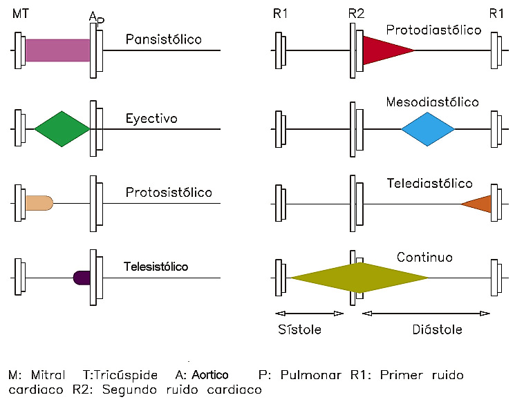 - Se caracterizan de muchas maneras, incluyendo (1) sincronización (sistólica, diastólica o continuos) y (2) significación clínica (benigna o patológica).