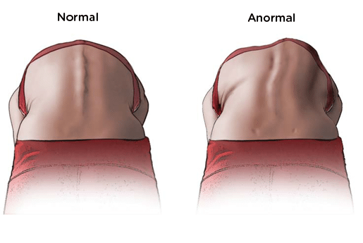 - Evalúe la presencia de escoliosis con el test de Adam. “Test de Adams”. Se hace con el paciente inclinado hacia adelante, brazos extendidos y rodillas rectas se puede observar asimetría del tronco, que se traduce en giba costal, la que se mide en centímetros. En la escoliosis idiopática lo usual es la giba costal derecha. Si bien esta prueba no evidencia la severidad de la enfermedad permitirá que el médico tratante solicite la radiografía del paciente para la identificación del tipo de tratamiento y en el peores de los casos una radiografía.
