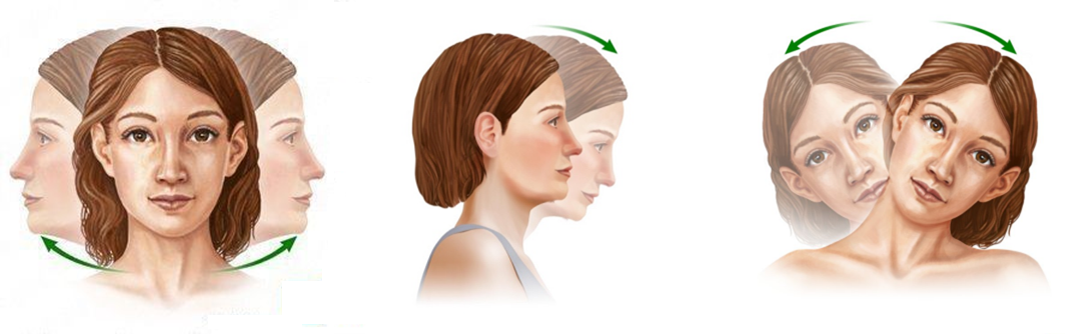 - Los rangos de movimiento de la columna cervical se muestran en la siguiente tabla. Pregunte siempre al paciente si desarrolla algún síntoma durante su rango de movimiento. Pídales que mantengan posiciones durante unos segundos en extremos de rango de movimiento y pregúnteles si desarrollan síntomas.
