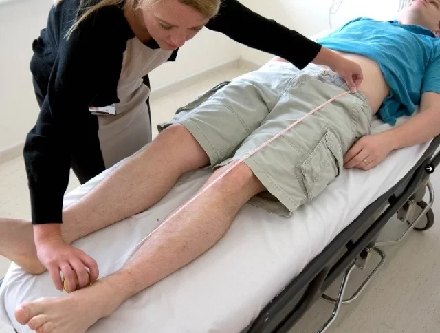 - Coloque su pulgar sobre la espina ilíaca anterosuperior y su dedo índice sobre el trocánter mayor. Si hay una distancia más corta entre el pulgar y el dedo del lado afectado, la causa está por encima del trocánter. Si no es así, pídale al paciente que flexione las rodillas con los pies juntos y compare los lados.