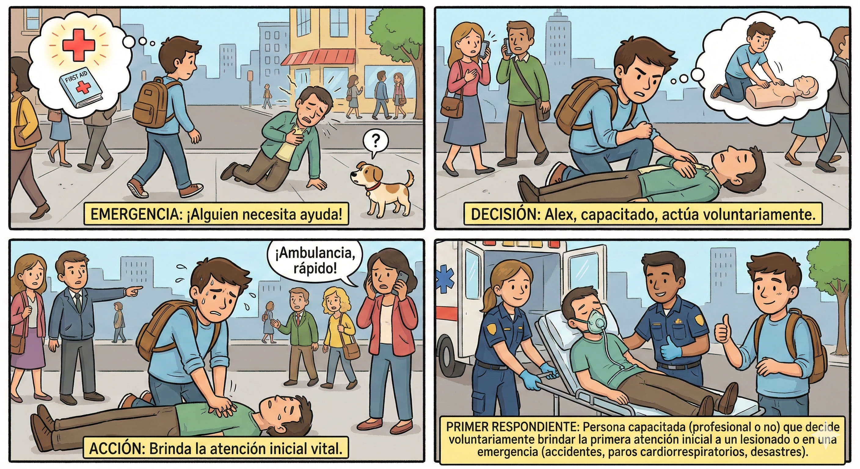 - Un primer respondiente es la persona capacitada —sea profesional de la salud o no— que decide voluntariamente brindar la primera atención inicial a un lesionado o en una emergencia (accidentes, paros cardiorrespiratorios, desastres). Sus funciones clave son evaluar la escena, asegurar el lugar, activar el sistema médico de urgencias (SME) y aplicar primeros auxilios básicos para mantener la vida hasta la llegada de ayuda especializada.