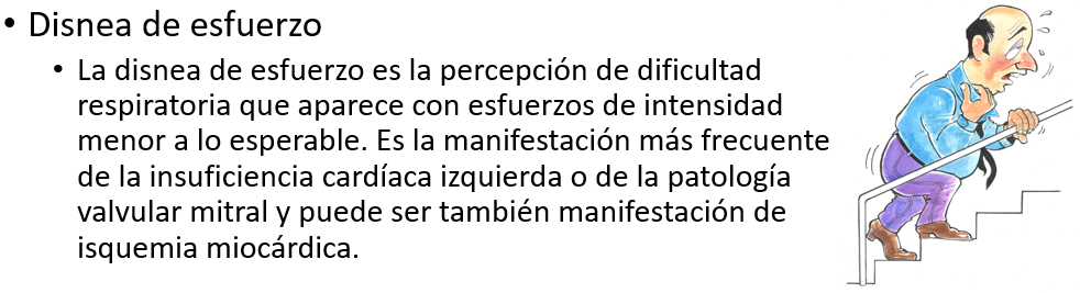 - Disnea, síntoma fundamental en el bronquítico crónico, que va, desde un cuadro de malestar o cierto agobio respiratorio en los períodos de agudización, hasta la disnea de esfuerzo, con crisis paroxísticas intercurrentes de tipo asmático o a forma obstructiva matinal, que cede