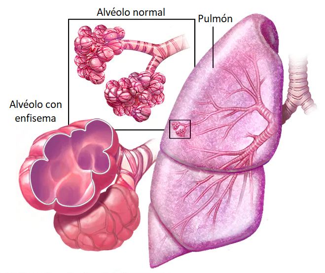 - Puede ocurrir una insuflación pulmonar aguda pasajera en el asma bronquial, pero cuando la obstrucción es crónica como en las bronquitis a repetición, los alvéolos rompen sus paredes, se funden unos con otros formando bulas de paredes finas con pérdida del tejido elástico y contenido aéreo atrapado. Se compromete además la perfusión pulmonar por mutilaciones arteriolocapilares. Todo lo anterior da lugar a varios tipos de insuficiencia respiratoria. En casos severos hay una hipertensión pulmonar que repercute sobre el corazón derecho (cor pulmonale). El enfisema generalizado puede complicarse con enfisema intersticial, enfisema mediastínico y neumotórax.
