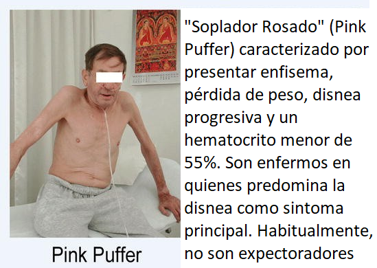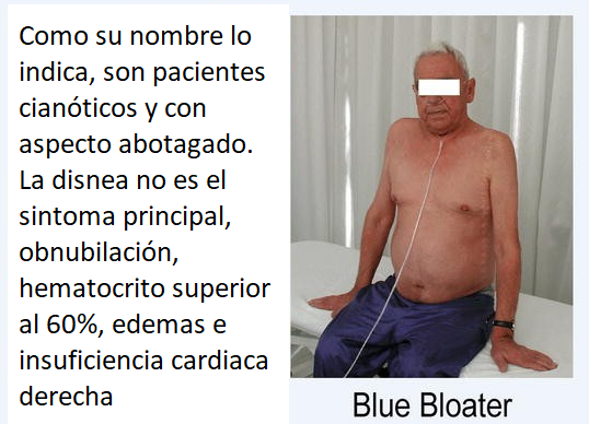 - En las enfermedades pulmonares obstructivas crónicas, se han descrito dos tipos clínicos clásicos, que reflejan los extremos del espectro: los Pink Puffers (PP) y los Blue Bloaters (BB).Antes se pensaba que los PP representaban a los enfisematosos y, los BB , a los bronquíticos crónicos. Sin embargo, hoy se sabe que la diferencia no está en el pulmón sino en su centro respiratorio. Los PP, por así decirlo , tienen un centro respiratorio activo, que los hace mantener los gases arteriales normales hasta avanzada la enfermedad ; en cambio, los BB, tienen un centro respiratorio más flojo y así desarrollan precozmente una hipoxemia.