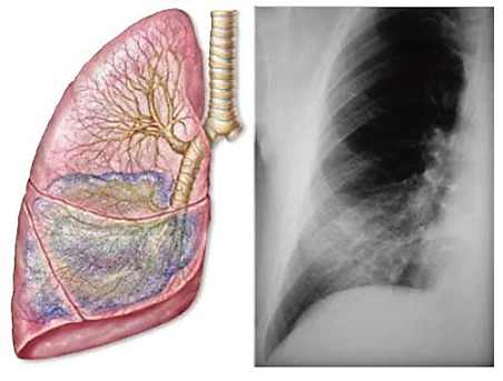 - Radiografía. Revela una sombra no homogénea de bordes pocos nítidos con broncograma aéreo; su tamaño y densidad dependerá del lóbulo afectado.