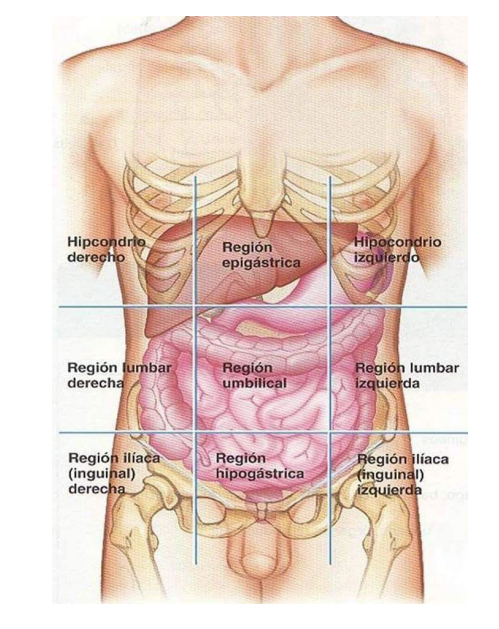 Para describir la ubicación de los hallazgos del examen físico, el abdomen se divide en nueve secciones o regiones, se trazan dos líneas que en su extremo superior son la continuación de las líneas torácicas medioclaviculares que hacia abajo llegan a los extremos laterales del pubis, y dos líneas horizontales, pasando la primera por el punto inferior del reborde costal a cada lado (10ª costilla), y la segunda, por las crestas ilíacas anterosuperiores. Se constituyen así las siguientes regiones, de derecha a izquierda: en el tercio más alto: