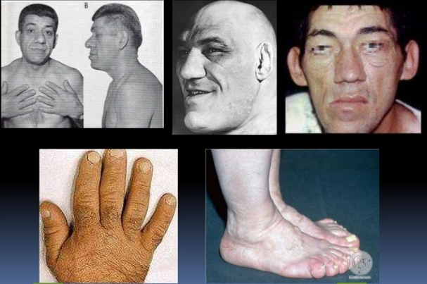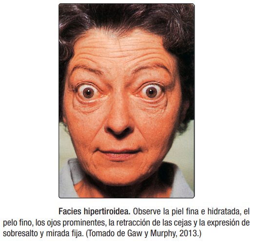 - Ejemplos de diagnóstico diferencial: La facies y expresión fisonómica puede orientarnos a diferentes patologías: La presencia de lesiones maculo papulosas escamosas eritematosas de distribución sobre superficies malares y puente de la nariz en “alas de mariposa” es característicos de Lupus eritematoso sistémico (LES); Acromegalia (agrandamiento de los huesos faciales; crecimiento de los tejidos blandos de nariz, labios y orejas); Mixedema (cara hinchada y embotonada, con edema periorbitario y pérdida temporal de las cejas); Síndrome nefrótico (cara pálida e hinchada con edema periorbitario); Enfermedad de Parkinson (disminuye la expresión facial, reducción del parpadeo y mirada fija con la cabeza inclinada hacia delante); Hipertiroidismo (piel húmeda y fina, exoftalmia y retracción palpebral, expresión asustada); Síndrome de Down (depresión del puente nasal con epicantus y pabellones auriculares bajos).
