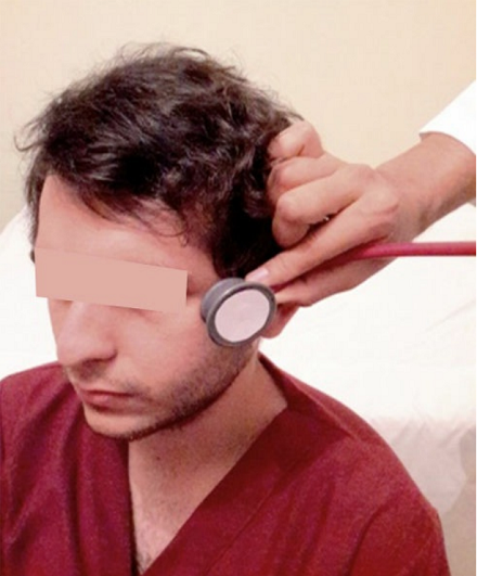- Si sospecha una anomalía vascular cerebral, utilice la campana del estetoscopio y ausculte sobre la región temporal, sobre los ojos y bajo el occipucio. Los soplos son indicios muy significativos de una posible anomalía vascular. También pueden asociarse a arteritis temporal. Para auscultarlas se pone la campana del estetoscopio sobre la región temporal, ojos y debajo del occipucio.