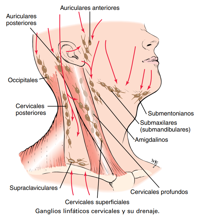 - A continuación se exploran los ganglios submandibulares a lo largo de la rama horizontal de la mandíbula, sin confundirlos con las glándulas salivares situadas en esa localización, y los submentonianos. Por último se palpan los ganglios cervicales, los auriculares y los supraclaviculares.