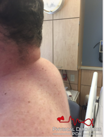 - A continuación, el examinador se pone de pie detrás del paciente y coloca los dedos en las fosas supraclaviculares mediales, hundidas en la clavícula y adyacentes a los músculos esternocleidomastoideos. Se solicitará al paciente que respire hondo mientras el examinador presiona profundamente hacia dentro y por detrás de las clavículas. Esto permite palpar cualquier adenopatía supraclavicular aumentada de tamaño cuando el paciente inspira. Los ganglios linfáticos palpables (Ganglio de Virchow asociado con cáncer gástrico) deben caracterizarse de acuerdo con la forma, tamaño, textura y movilidad.