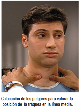 - Observar y palpar la tráquea con el dedo pulgar a cada lado, situándola en la línea media. Compara el espacio existente entre la tráquea y el músculo esternocleidomastoideo a cada lado. Al desplazarla lateralmente se nota una crepitación de la fricción con la columna.