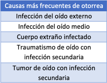 - Los hallazgos más frecuentemente encontrados en el CAE son cerumen, dermatitis y otorrea. La otorrea es una descarga líquida en el CAE, que puede ser hemática (otorragia), purulenta, serosa o acuosa. Si es de muy mal olor orienta a infección por germen atípico, mientras que si tiene manchas negras o hifas orienta a infección micótica. La otorrea puede ser por otitis externa u otitis media que a través de una perforación en la membrana timpánica drena hacia el CAE. Si es acuosa puede corresponder a LCR, en cuyo caso se denomina otorraquia.