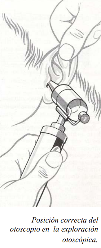 - La introducción del otoscopio debe realizarse en la dirección de la porción ósea del CAE de forma delicada, se recomienda comenzar con el de mayor diámetro para una mejor imagen y una adecuada iluminación. Si el otoscopio seleccionado no penetra adecuadamente se va disminuyendo progresivamente su tamaño. Es importante cambiar el otoscopio entre uno y otro oído si sospechamos que el primero estuviese infectado.