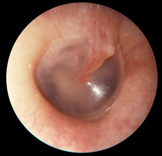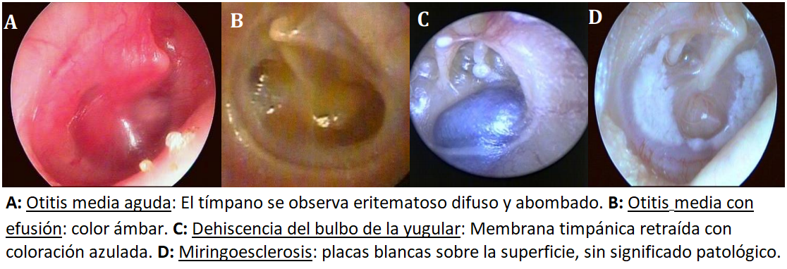 - Normalmente es translúcida, es decir, deja pasar parte de la luz, permitiendo la visualización de las estructuras subyacentes. Cuando está alterado no deja pasar nada de luz y se observa opaco. El tímpano normal tiene una coloración blanco nacarado, a veces, levemente enrojecido o ambarino y con algunos vasos sanguíneos. El llanto o maniobras de Valsalva aumentan esa coloración y también ingurgitan los vasos. Otoscopías con aspecto y coloración alterados