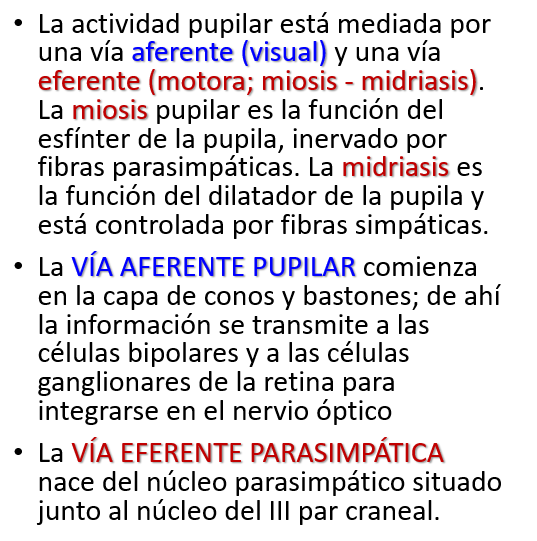 - Tamaño de la pupila (3 mm de diámetro) / forma / simetría, ptosis, alineación Acomodación (respuesta cercana o constricción en el intento de convergencia)