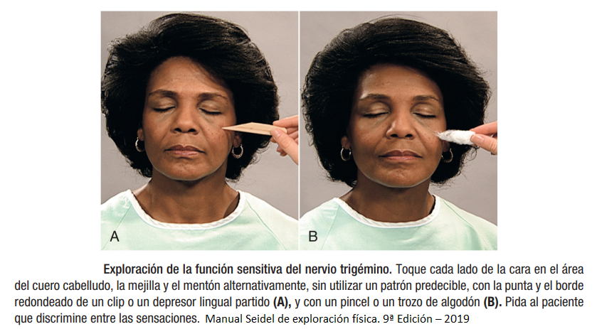 - La función sensitiva, pida al paciente que cierre los ojos y después utilice una torunda de algodón para tocar con suavidad diversas partes de la cara del paciente, en los dos lados. El paciente debe indicar cuándo percibe el roce del algodón sobre su piel. Para la valoración del relejo corneal pida al paciente que mire hacia arriba y a lo lejos. (si utiliza lentes de contacto es necesario retirarlas antes de esta prueba) ahora, aproxímese al paciente desde uno de sus lados, fuera de su línea de visión, evitando las pestañas, roce ligeramente su córnea (no solamente la conjuntiva) con una fina torunda de algodón.