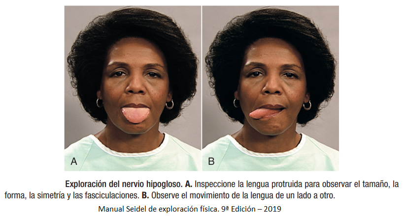 - Inspeccione la lengua del paciente mientras está en reposo en el suelo de la boca y al protruirla. Pídale que mueva la lengua dentro y fuera de la boca, de un lado a otro, y que la ondule hacia arriba como si fuera a tocarse la nariz y hacia abajo como si fuera a lamerse el mentón.