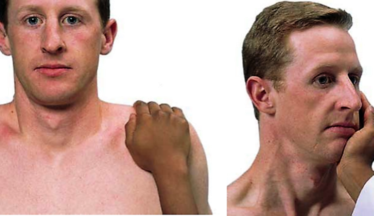 - Pruebe la fuerza muscular de la lengua pidiendo al paciente que empuje la lengua contra la mejilla mientras aplica resistencia con un dedo índice. Cuando escuche el habla del paciente, no deberían ser evidentes problemas con los sonidos dentales (l, t, d, n). No es de esperar fasciculación, asimetría, atrofia ni desviación de la línea media.