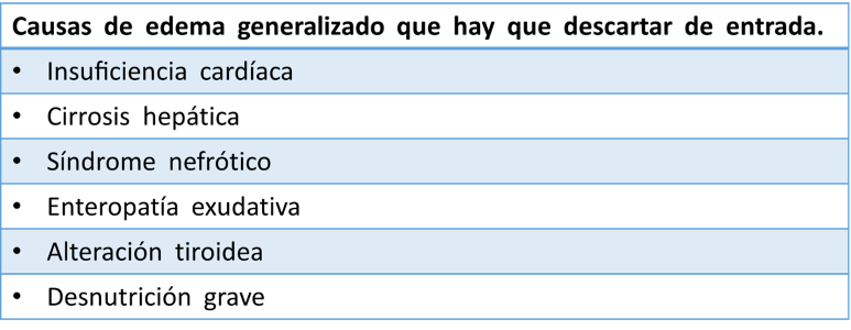 - Edema generalizado: Se produce en todo el cuerpo, son secundarios a una causa de orden sistémico. Por ejemplo, la anasarca es un edema generalizado que se produce en la piel, las mucosas y los órganos internos.