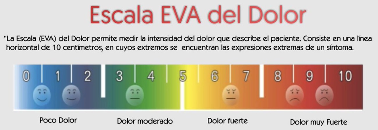 - Escala Visual Analógica (EVA): Esta escala consiste en una línea de 10 centímetros donde se coloca "no dolor" en un extremo y "máximo dolor imaginable" en el otro extremo. El paciente debe marcar en la línea el punto que mejor representa la intensidad de su dolor.