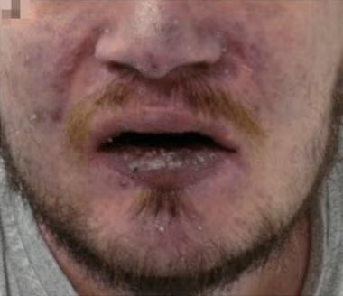 Cyanosis. Facial cyanosis in a patient with chronic hypoxemia. Courtesy of BioMed Central Ltd, Springer Nature [Patzig M, Laub C, Janssen H, Ertl L, Fesl G. Pseudo-subarachnoid haemorrhage due to chronic hypoxaemia: case report and review of the literature. BMC Neurol. 2014 Nov 18;14:219.].