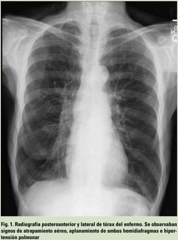 - Paciente de 57 años de edad, fumador de 20 cigarrillos al día desde que tenía 20 años (índice paquetes/año de 37), con antecedentes de hipertensión arterial tratada con inhibidores de la enzima convertidora de la angiotensina, dislipidemia y diabetes tipo 2 tratada con antidiabéticos orales. Era independiente para las actividades de la vida diaria y trabajaba de administrativo. Fue derivado a la consulta de neumología por el médico de Atención Primaria por presentar disnea progresiva. Cuando acudió a nuestra consulta, se realizó una anamnesis minuciosa en la que el paciente refería que llevaba varios años con disnea de esfuerzo, pero al no limitarle en sus actividades diarias no consultó. Sin embargo, exponía que desde hacía varios meses, actividades que hasta hacía poco podía desarrollar con normalidad le fueron resultando dificultosas (subir escaleras, cuidar el jardín, cargar peso, etc.). El cuadro clínico fue empeorando progresivamente hasta el punto de tener disnea cuando andaba en llano unos 100 metros aproximadamente. También refería varios catarros anuales con tos y expectoración verdosa con toma de antibioterapia una vez al año.