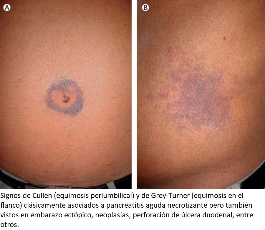 - La decoloración oscura o la equimosis franca alrededor del ombligo o los flancos pueden ocurrir con el hemoperitoneo, incluyendo sangrado retroperitoneal en el contexto de necrosis pancreática