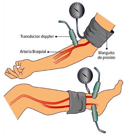- Para la realización de esta prueba se requiere de un Doppler Vascular (Mhz) y un esfigmomanómetro, Ilustración 8. Antes de iniciar la medición de la presión sistólica, el paciente debe de estar en reposo en decúbito supino durante al menos 5 minutos.