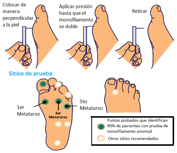 - Pedir al paciente que responda “Sí” cuando sienta que se le está tocando el pie con el monofilamento (No preguntar: ¿Sintió eso?).