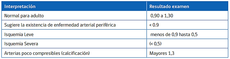 - Es una de las pruebas no invasivas más confiables para evaluar la presencia de EAP, corresponde al cociente entre las presiones sistólicas máximas de las arterias tibial posterior o pedio con relación a la presión máxima de la arteria braquial (se mide bilateralmente y se utilizan los valores más altos encontrados).