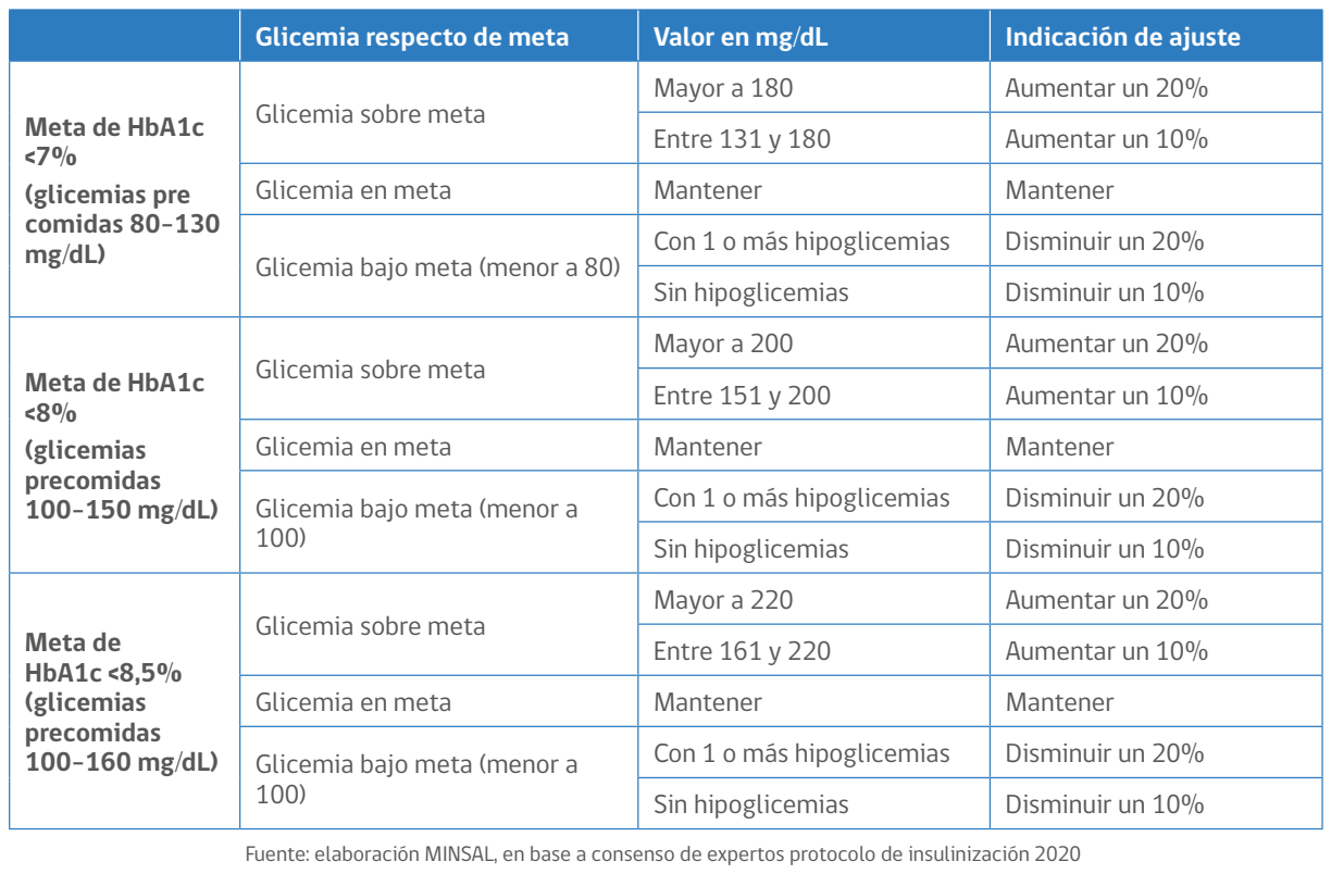 - Ajuste de dosis para logro de metas; se sugiere titular las dosis de insulinoterapia según la meta de glicemia, de acuerdo a ajustes indicados en tabla
