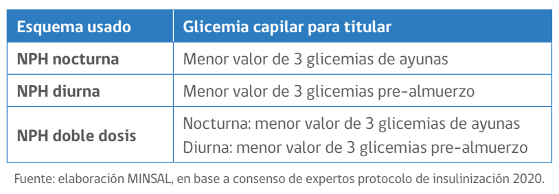 - En el esquema doble dosis NPH, siempre la primera dosis a ajustar será la NPH nocturna (con la glicemia de ayuna) y posteriormente la diurna (con la glicemia pre-almuerzo).