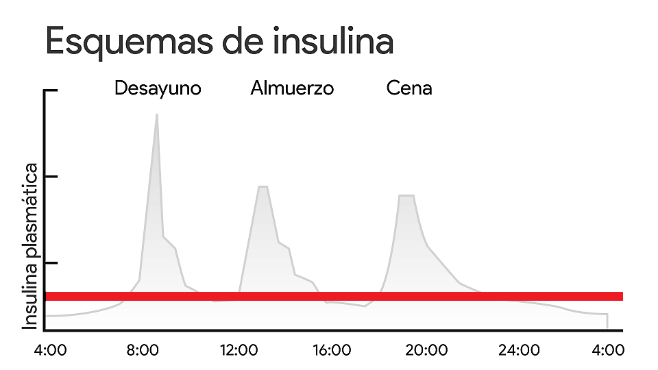 - El esquema basal incluye 1 o 2 dosis de insulina basal, pretendiendo simular la secreción pancreática basal de insulina, cuyo objetivo principal es frenar la neoglucogénesis hepática y no el de cubrir la secreción prandial en respuesta a comidas. En general es el esquema con que se inicia el tratamiento insulínico, ya que en personas con DM2 es posible que ante una carga moderada de carbohidratos la secreción pancreática residual pueda cubrir los picos glicémicos prandiales. El uso de 3 dosis de NPH diarias no es aconsejable dado el alto riesgo de hipoglicemias asociado al uso de este esquema.