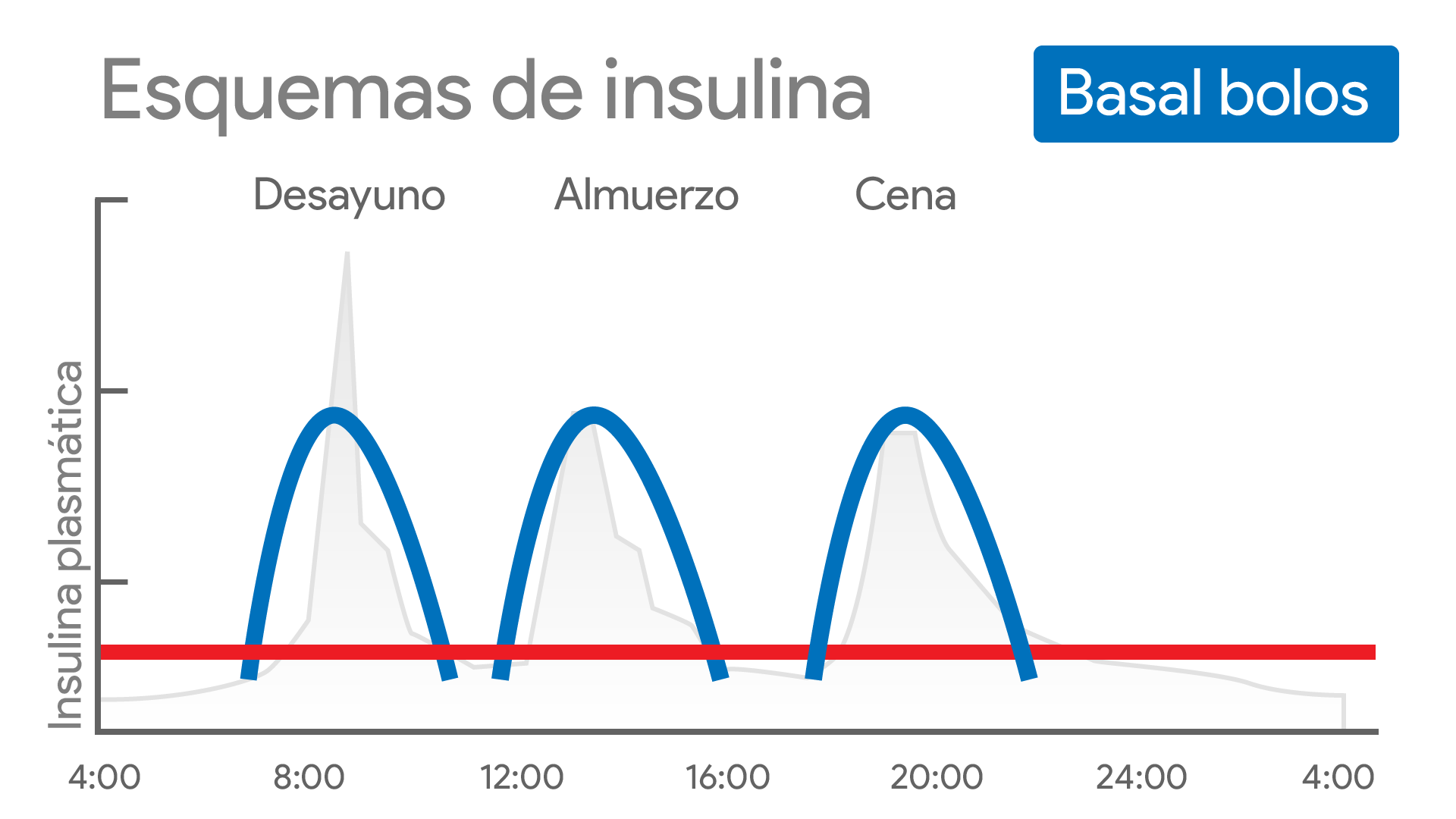 - También llamada terapia basal-bolo. De elección en los pacientes con DM tipo 1. Intenta imitar la secreción fisiológica de insulina con 2 componentes: una secreción continua de insulina, y una secreción rápida de insulina estimulada por la ingesta. Por lo tanto, consiste en la inyección de insulina basal y la administración de bolos en relación con las comidas a lo largo del día.