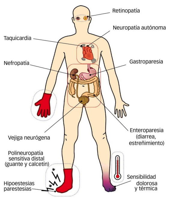 - La neuropatía está presente en menos de un 10% de los diabéticos en el momento del debut de la enfermedad, pero afecta a un 50% de los que tienen más de 25 años de evolución. Es más frecuente en diabéticos con mal control metabólico, aunque también puede aparecer en pacientes con buen control. Se caracteriza por una combinación de degeneración axonal (preferentemente distal) y desmielinización segmentaria.