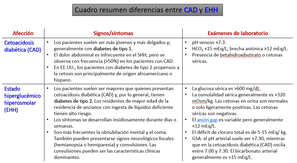 - La cetoacidosis diabética (CAD), es una de las complicaciones metabólicas agudas más serias de la diabetes mellitus (DM), se caracteriza por hiperglicemia, acidosis metabólica, deshidratación y cetosis. Se manifiesta sobre todo en pacientes con DM tipo 1, pero aquellos con DM tipo 2 también son susceptibles de desarrollarla. La CAD puede ser la forma clínica inicial de presentación tanto de la DM 1 como de la DM 2.