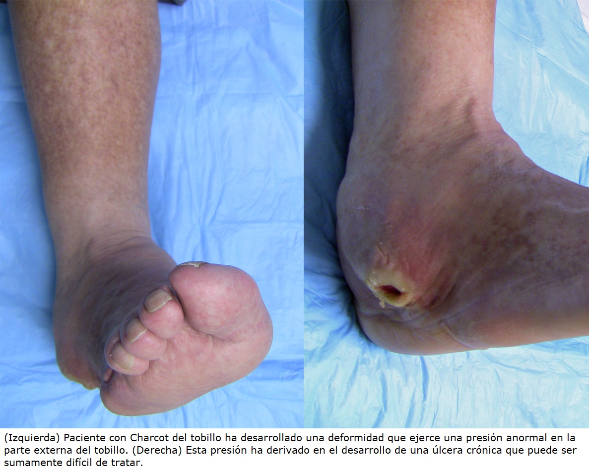 - El daño en los nervios causado por la diabetes se denomina neuropatía diabética. Uno de los problemas más graves que puede provocar la neuropatía diabética es la artropatía de Charcot (también conocida como neuroartropatía de Charcot o, simplemente, pie de Charcot).