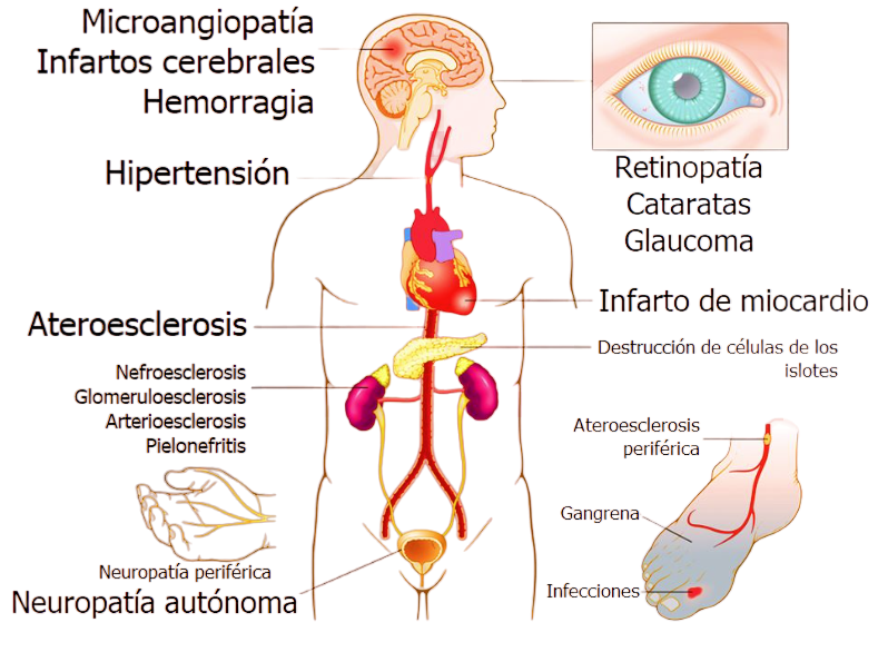 - macrovasculares (equivalente a arteriosclerosis), que son las que afectan a las arterias en general produciendo enfermedad cardíaca coronaria, cerebrovascular y vascular periférica;