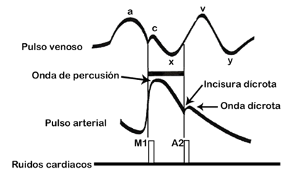 - Con el registro flebográfico, se comprueba que el pulso venoso está constituido por tres ondas positivas (“a”, “c” y “v”), de las cuales dos (“a” y “v”) son clínicamente detectables y, por dos ondas negativas denominadas senos “x” e “y”.
