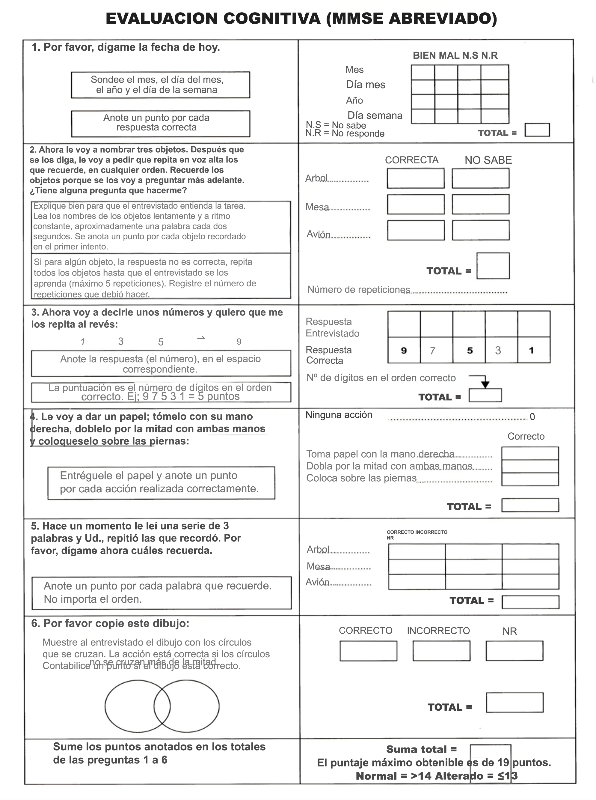 - El instrumento consta de 6 ítems que suman un total de 19 puntos. Se considera que existe una sospecha de deterioro cognitivo si el paciente obtiene un puntaje menor a 13 puntos.