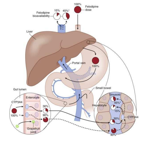 El efecto de primer paso, también conocido como efecto presistémico, se refiere al fenómeno por el cual algunos medicamentos administrados por vía oral son metabolizados por el hígado antes de alcanzar la circulación sistémica. Esto ocurre cuando los fármacos absorbidos en el intestino delgado ingresan primero en la circulación portal hepática a través de la vena porta. Las enzimas hepáticas pueden alterar significativamente estos fármacos durante este primer paso, reduciendo su concentración antes de que lleguen a la circulación general. Debido a este efecto, la vía oral puede ser menos conveniente para ciertos medicamentos que se metabolizan extensamente en el hígado. - Un ejemplo notable es la nitroglicerina, que aunque se absorbe bien, se metaboliza eficazmente durante el primer paso hepático, limitando su disponibilidad sistémica. Sin embargo, cuando la nitroglicerina se administra por vías alternativas, como la sublingual o transdérmica, puede alcanzar niveles sistémicos adecuados, evitando el efecto de primer paso. Es importante destacar que los fármacos administrados por vías no orales, como la sublingual, intravenosa, intramuscular o transdérmica, evitan la circulación portal hepática inicial y, por tanto, no son sometidos al efecto de primer paso, permitiendo una mayor disponibilidad del medicamento en la circulación sistémica.
