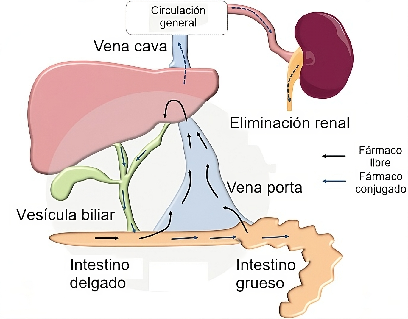 - Hepática: Los fármacos pueden ser metabolizados en el hígado y luego excretados en la bilis, que se libera en el intestino y puede ser eliminada en las heces. Algunos fármacos pueden sufrir el ciclo enterohepático, donde se reabsorben en el intestino y regresan al hígado.