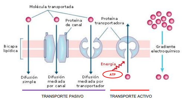 - Transporte activo: Es el pasaje de sustancias a través de una membrana en contra de un gradiente de concentración. Este tipo de transporte requiere de un gasto de energía y predomina en: membranas de neuronas, plexo coroideo, células de los túbulos renales y hepatocitos. Analogía