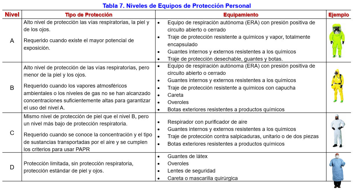 La agencia de protección del ambiente (EPA) de los Estados Unidos, ha identificado cuatro niveles de protección Cuanto más se sepa sobre la sustancia y los peligros del sitio del incidente, más fácil será seleccionar el equipo adecuado. Cada nivel de EPP consiste en una combinación de diversos grados de protección respiratoria, ocular y cutánea, donde el "nivel A" garantiza la protección máxima y la el “nivel D” protección mínima(8). En la Tabla 7 podemos ver los diferentes niveles de EPP.