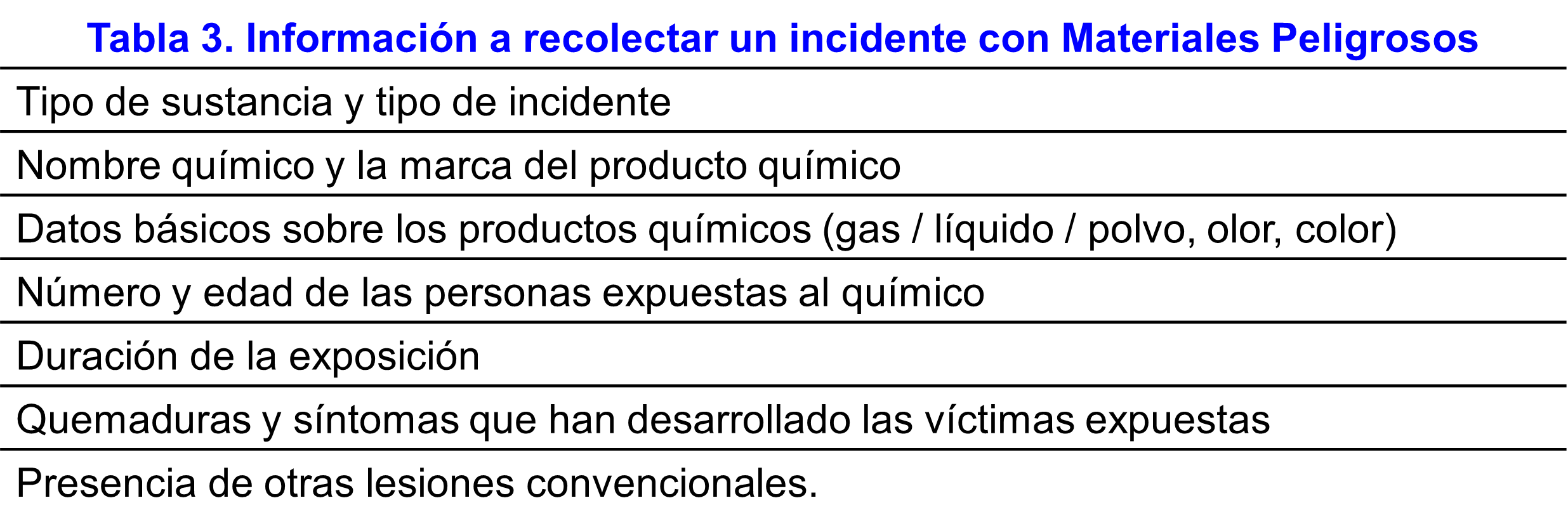 - Toda información es valiosa para reconocer la posibilidad de un incidente con MatPel. Inicialmente, el despachador de los SME puede proporcionar información del incidente. Sin embargo, los primeros respondedores deben intentar recopilar la mayor cantidad de información posible sobre las circunstancias del accidente antes de ingresar a la escena. En la Tabla 3 se identifica una lista de información por recopilar en ante un posible incidente de MatPel.