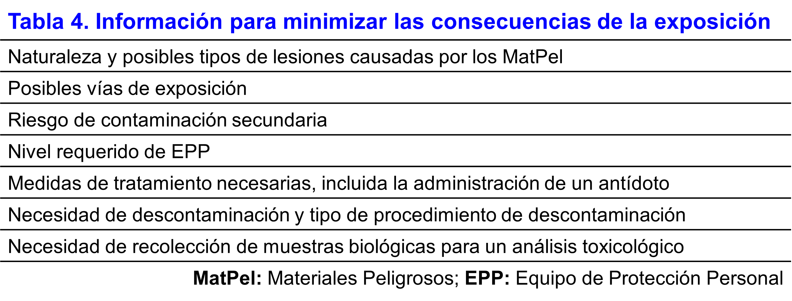 - Con la información recolectada descrita en la Tabla 3, se logrará que el equipo de SME se comunique de manera más eficiente con el apoyo toxicológico, obteniendo las instrucciones e información para minimizar las consecuencias de la exposición descritas en la Tabla 4.