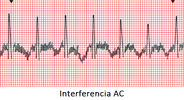 - La interferencia de AC puede ocurrir cuando se utiliza una máquina de ECG operada por AC (corriente alterna)y conectada a tierra incorrectamente, o cuando se obtiene un ECG cerca de cables de alta tensión, transformadores o aparatos eléctricos. Esto da como resultado una línea base gruesa compuesta de ondas de 60 ciclos.