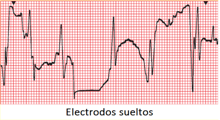 - Los electrodos sueltos, o los electrodos que tienen un contacto eléctrico deficiente con la piel debido a una pasta o jalea seca o insuficiente para electrodos, pueden causar múltiples picos y ondas agudos en el ECG y son la causa más común de artefactos. Los cables de conexión sueltos también pueden causar artefactos similares. Además, cualquier materia extraña en la piel, como sangre, vómito, sudor y cabello, puede provocar un contacto deficiente del electrodo y la aparición de artefactos.