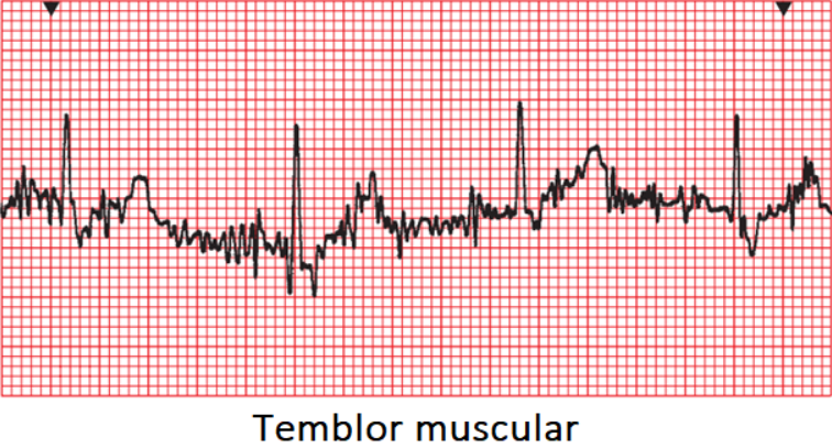 - El temblor muscular puede ocurrir en pacientes tensos o nerviosos o en aquellos que tiemblan de frío, y puede dar al ECG una apariencia fina o toscamente dentada.